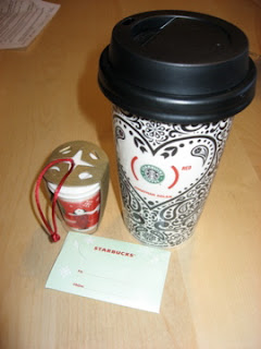I understood that it was supposed to be an ornament exchange, so I just sent my poor secret Santa an ornament (a handmade one, that I put lots of love into)… MY secret Santa, on the other hand, treated me to something I would always LOVE to have but never actually buy for myself – a gorgeous ceramic travel mug from Starbucks, PLUS a $5 Starbucks gift card, AND the super cute Starbucks mug ornament! WOW!